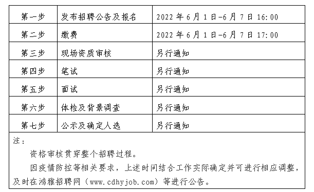 2022年6月1日至2022年6月7日16:00 在鴻雅招聘網(wǎng)(http://www.cdhyjob.com/)、鴻雅微信公眾號、國控集團官方網(wǎng)站(http://www.848734.com/)及上級部門要求的相關網(wǎng)站等發(fā)布招聘公告。