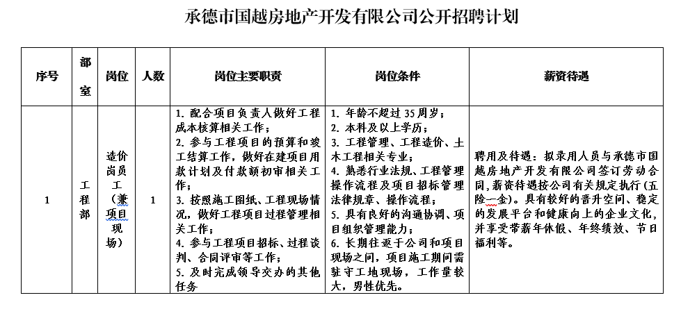 本次擬招聘1個崗位共計1人。具體應聘條件見附件《承德市國越房地產(chǎn)開發(fā)有限公司公開招聘計劃表》 。