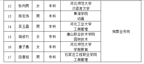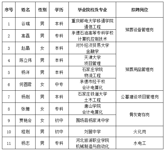 因公司發(fā)展需要,承德市國(guó)瑞置業(yè)有限公司委托第三方機(jī)構(gòu)面向社會(huì)公開招聘殯儀館運(yùn)營(yíng)各崗位人員17名?,F(xiàn)對(duì)擬錄用人員信息進(jìn)行公示,公示期間如有異議,可通過(guò)電話、信函等方式反映,反映意見請(qǐng)署真實(shí)姓名。